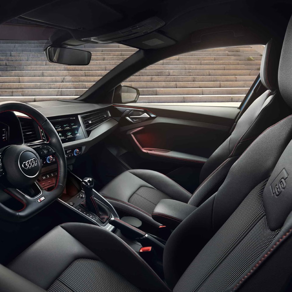 I dettagli sportivi includono cuciture in Rosso Audi Sport, che impreziosiscono gli appoggiabraccia delle portiere, la corona del volante, i tappetini, i sedili sportivi, l’appoggiabraccia anteriore e quello centrale.