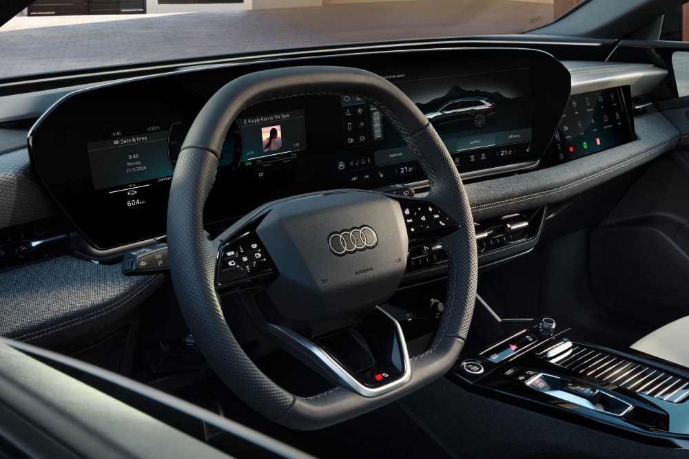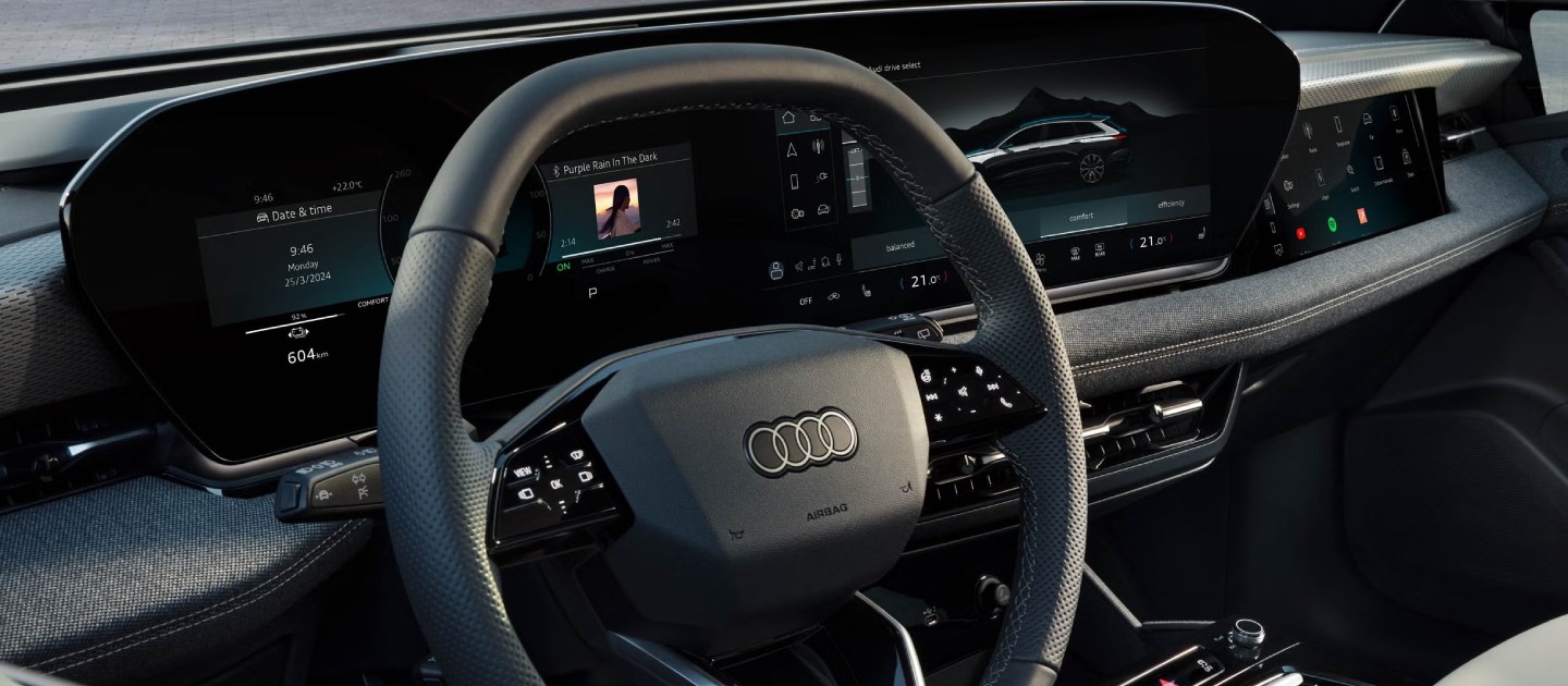 Scopri i nuovi interni digitali con sistemi innovativi, come il display panoramico con tecnologia OLED, l’head-up display con realtà aumentata, l’assistente vocale Audi, lo smart door panel integrato nella portiera del conducente, la luce interattiva dinamica e il suono 3D con altoparlanti integrati negli appoggiatesta.