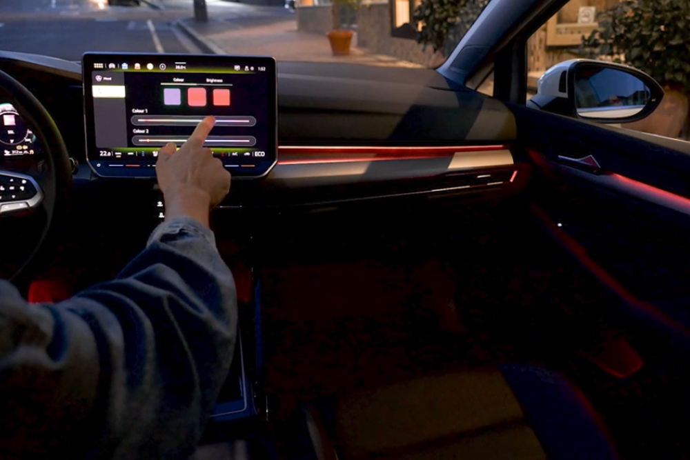 Con un semplice tocco del dito puoi illuminare delicatamente gli interni della tua Nuova Golf, scegliendo fino a 30 colori1. Elementi decorativi luminosi consentono di creare un'atmosfera personalizzata.