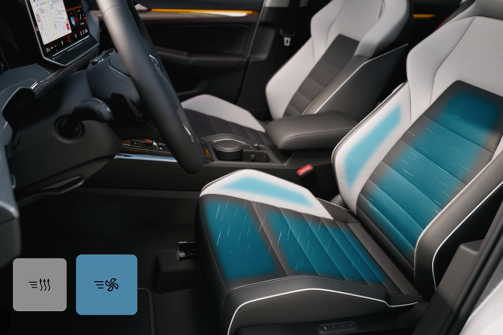 I sedili di Nuova Golf non sono solo comodi, ma anche versatili. Il sedile posteriore con schienale divisibile e ribaltabile consente di ampliare il vano bagagli per le tue esigenze. A seconda dell'allestimento, i sedili sono rivestiti in tessuto o in ArtVelours. I sedili in pelle sono disponibili come optional con climatizzazione attiva, che rinfresca in estate e riscalda in inverno. La funzione di massaggio sul lato guida innalza ulteriormente il livello di comfort: viziatevi un po' anche in viaggio e allentate la tensione della vita quotidiana.