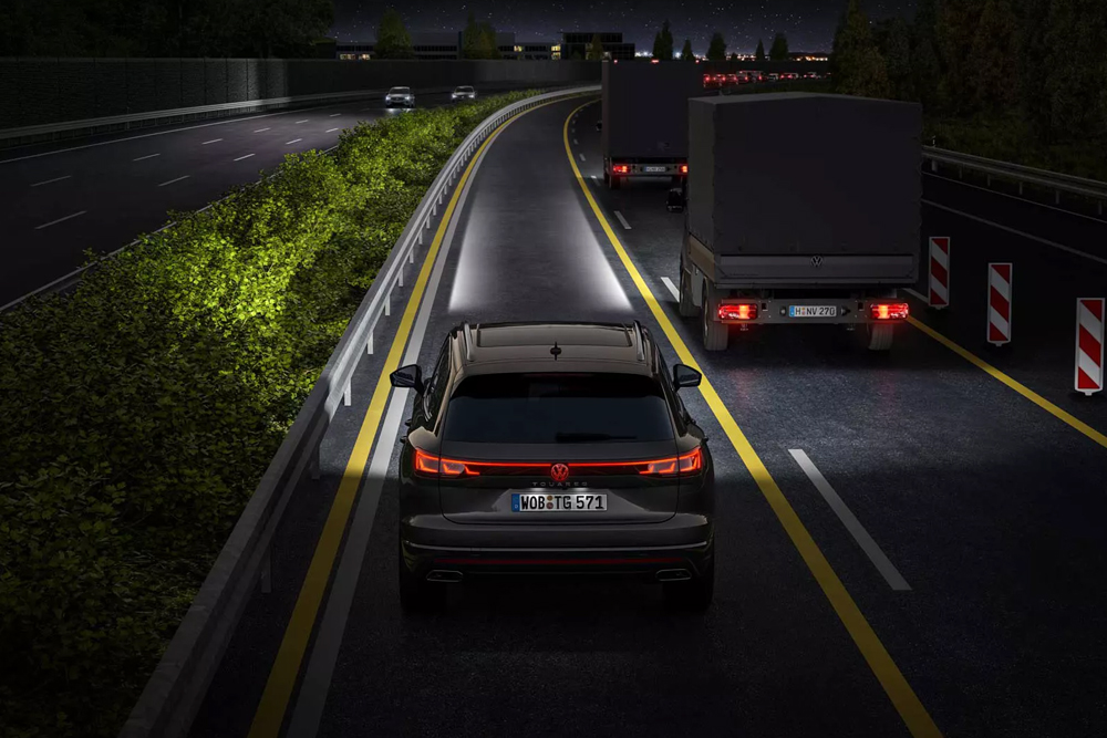 Gli innovativi fari IQ.LIGHT Matrix HD opzionali di Nuova Tiguan colpiscono anche quando l’auto è ferma grazie ad oltre 19.000 LED controllati individualmente. Includono anche il logo illuminato anteriore e posteriore, e una proiezione luminosa che ti dà il benvenuto e ti saluta prima e dopo ogni viaggio. Le strisce luminose sulla calandra anteriore e sul retro, gli indicatori di direzione dinamici, nonché l'illuminazione dell'area con motivo proiettato lateralmente dagli specchietti retrovisori e le maniglie delle porte illuminate completano la sua straordinaria firma luminosa. Goditi un'esperienza di guida notturna grazie alla tecnologia Matrix che ti consente di guidare con gli abbaglianti accesi senza disturbare gli altri conducenti. Inoltre, la tua Nuova Tiguan può proiettare segnali sulla carreggiata per aiutarti quando guidi attraverso i cantieri autostradali e migliorare la visibilità.