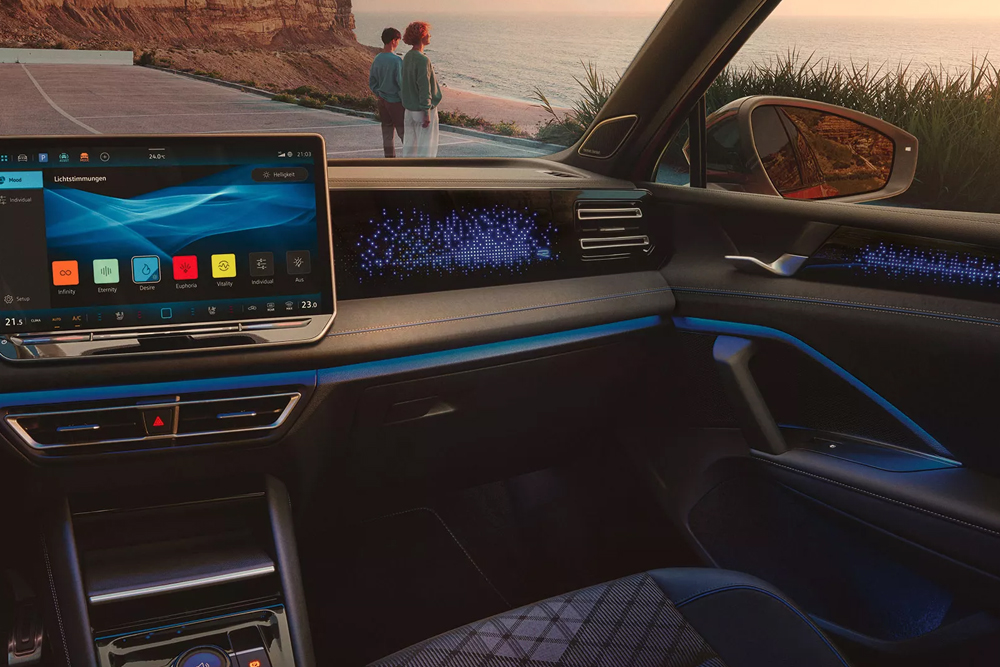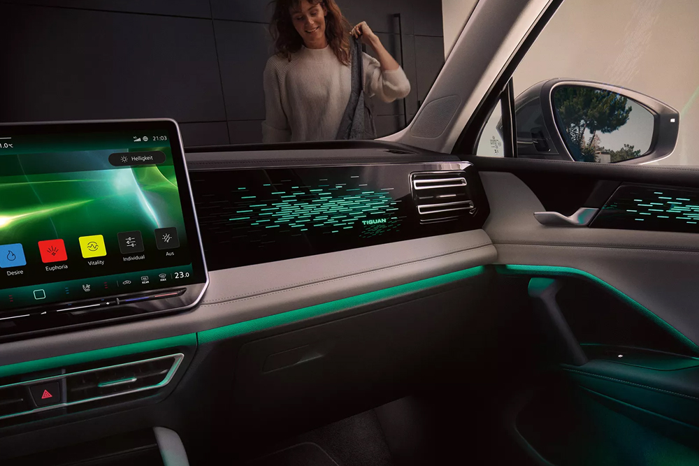Ambient Light con un semplice tocco ti permette di illuminare delicatamente gli interni di Nuova Tiguan e scegliere tra 30 colori differenti. Cinque strisce luminose ed elementi decorativi consentono di creare un'atmosfera personalizzata. Caratteristiche speciali sono il logo R‑Line o la scritta Tiguan illuminati sul cruscotto, disponibili in base alla versione scelta.